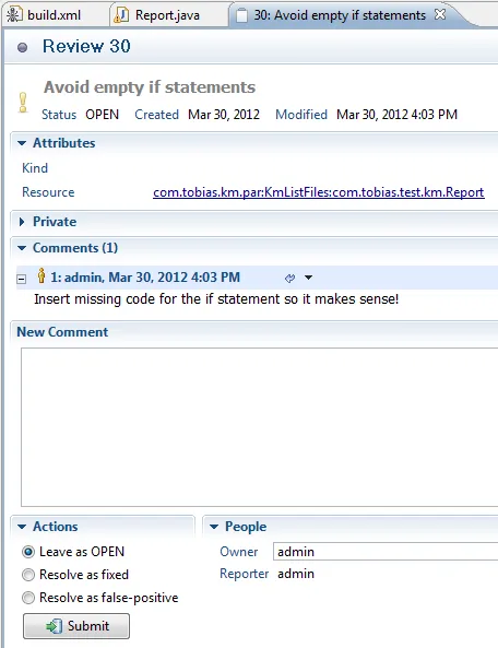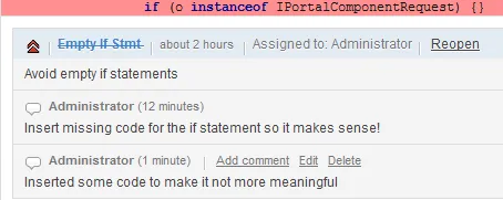 Without leaving Eclipse the developer can act on the violations assigned to him. A special feature is the ability to click on the resource link in the tasks and Eclipse will open the corresponding file automatically. The developer can mark the task as solved from within Eclipse and the task will get updated.
