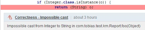 To show what findbugs do I prepared a rather simple example. The code simply will do a cast that cannot work: