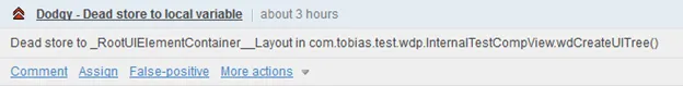 The dead store issue may or not be an error of the developer (or javac). Because I prepared the code, I know that the error stems from a coding error. In the view a value node with cardinality 0..n was created. Without initialization of the node this throws a NullPointerException during runtime. Changing the cardinality to 1..n and running Sonar again: