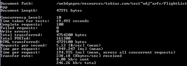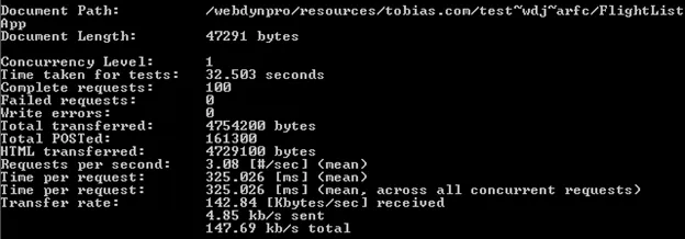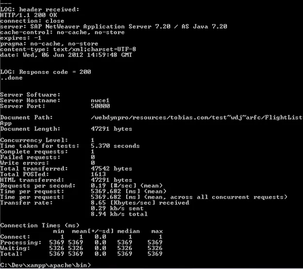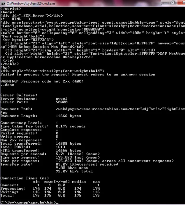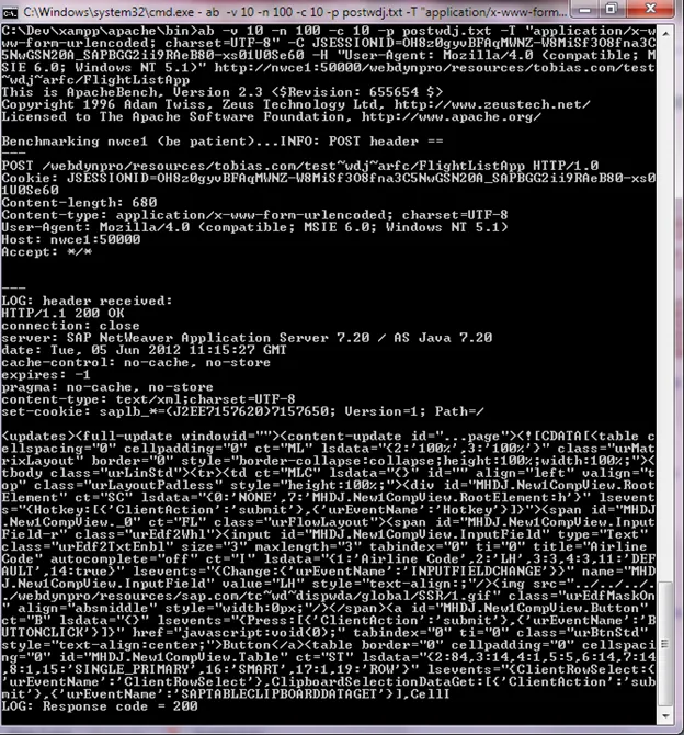 I build an example WDJ application using the steps outlined here 🔗: it’s and Web Dynpro Java application containing a table that shows the data of the get flight BAPI. For testing forms that require an input you cannot use ab (meaning: setting the input and call the form action), but you can use ab to simulate actually what happens after the input is set and the send button is clicked: the POST action of the browser.