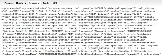 The returned content is an XML file containing the data for the table. As you can see, WDJ return the table content as HTML. [Note: Whoever at SAP was or is or will be responsible for this: why? And please stop doing this. This should be done via AJAX and JSON / XML, and definitely you should not transfer HTML. That makes me wonder if the HTML transferred back changes between browsers.]