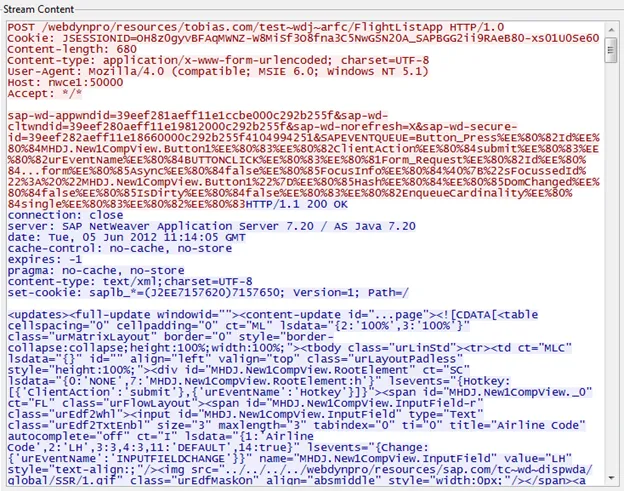 Did it worked? No. Why? “Request referes to an unkown session”. Unkown session? Yes, even with JSESSIONID as the AS Java session identifier, WD is more complex. Take a look at the complete POST data: