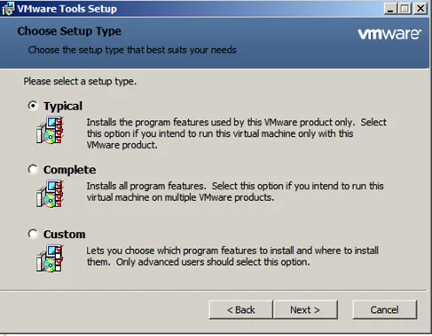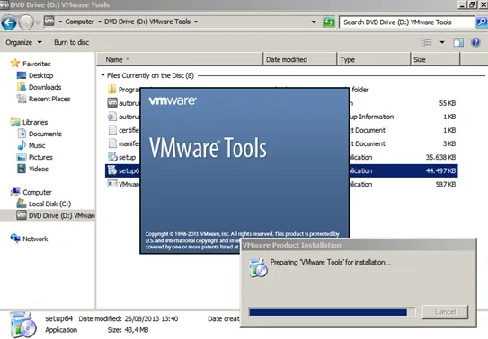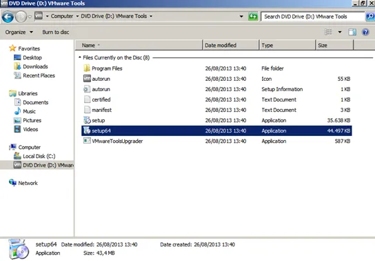 This inserts a virtual CD that contains the VM Ware tools files. Open the Windows Explorer, navigate to the CD drive. Start the installation by running the file setup64.exe.