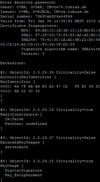 /<location of SMP 3>/sapjvm_7/bin/keytool -import -v -alias nw74 -keystore smp_keystore.jks -file nw74.tobias.de