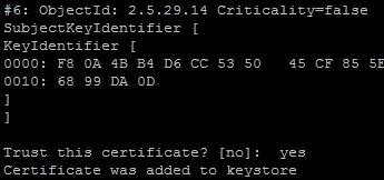 The keystore tool shows the information of the certificate and asks if you really want to import the certificate. Answer as yes and the certificate is added to the trusted list.