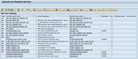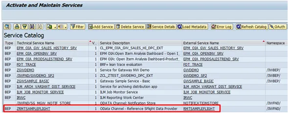 After installing a SAP NetWeaver Gateway system, you’ll want to play around with a OData service. One option is to create everything from scratch; another option is to use a sample service that serves as a basis for learning. SAP NetWeaver ABAP comes with the flight sample, and to no surprise, SAP Gateway comes with a sample OData service based on the flight sample. To maintain a service, transaction /IWFND/MAINT_SERVICE is used. It shows a list of available services: