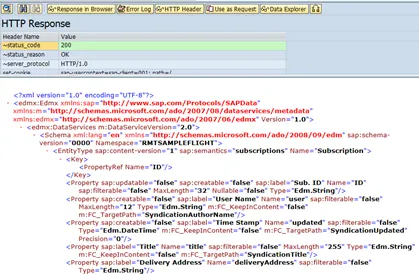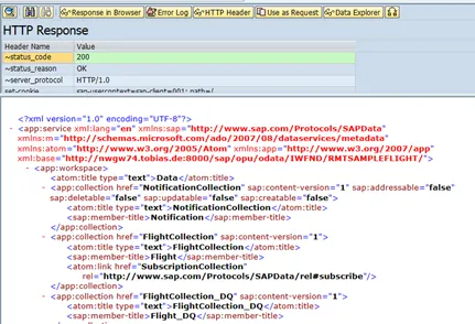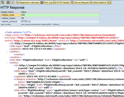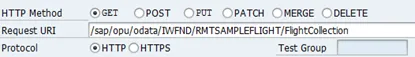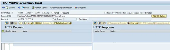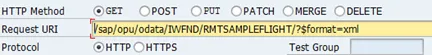 Note that in the Request URI field the service URI is already inserted: /sap/opu/odata/IWFND/RMTSAMPLEFLIGHT/?$format=xml