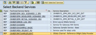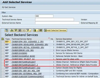 The OData service for the flight data is RMTSAMPLEFLIGHT or RMTSAMPLEFLIGHT_2. Select the services you want to add and click on Add Selected Services.