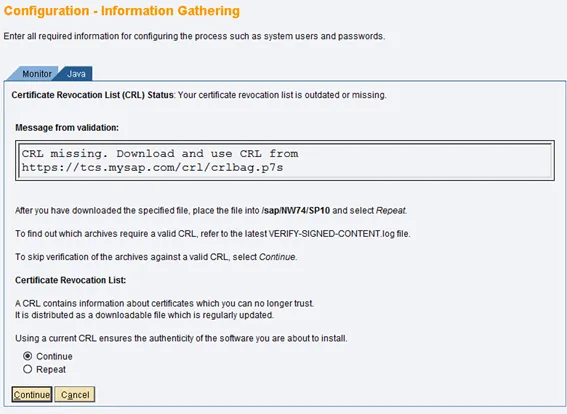 SUM can continue without verifying the files, but that’s some kind of security breach you will commit. Therefore it is better to do as the message text tells you: download the file and place it into the foler. Download the CRL from here: https://tcs.mysap.com/crl/crlbag.p7s 🔗. Copy the file to the directory that contains the SCA files