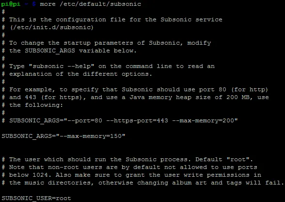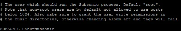 How to make subsonic use that user and run under that user id and not as root? The user information is stored in the default subsonic configuration file: /etc/default/subsonic.