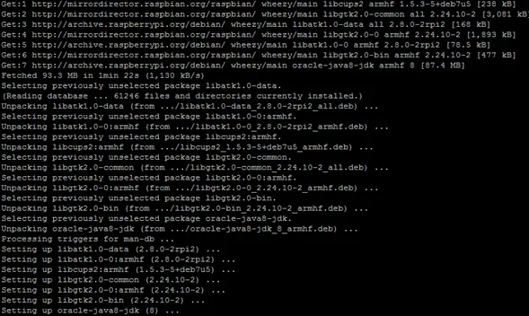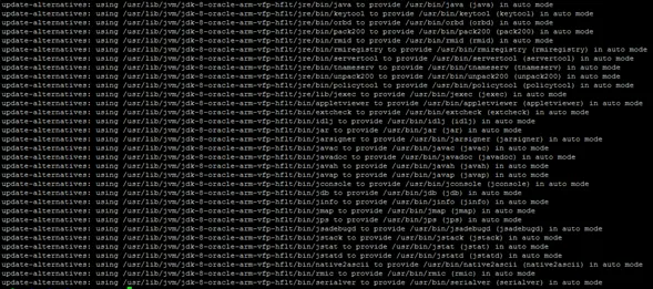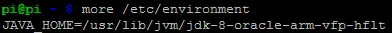 Java is installed, but for applications to know where to find it, an environment variable is used: JAVA_HOME. This variable points to the install dir of Java. To not have to configure this for each user, the configuration can be made global to all. The above command installed Java 8 at this location: /usr/lib/jvm/jdk-8-oracle-arm-vfp-hflt