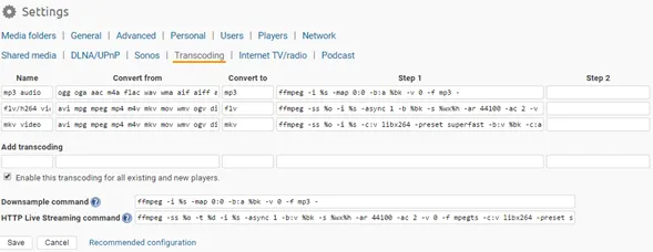It may be useful to transcode some music files on the fly. For instance, when the consumed bandwidth is too high, FLAC is used or when the user is accessing Subsonic over a low bandwidth network like 4G in Brazil. Subsonic allows for automatic transcoding of files. This feature can be activated for each user and the sampling limit can also be specified. It is therefore possible to define a user for mobile client usage and specify a max bitrate of 128 Kbps for him. The max bandwidth is defined in the user section of the configuration settings.