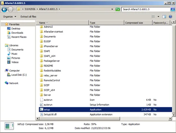 Download the installer, unpack it on Windows Server 2008 R2. Open the Afaria folder and run setup.exe