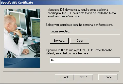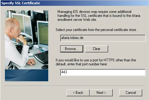 For the enrollment server to work, it must know the address of the SAP Afaria server. In my case both servers are on the same computer, so I can use localhost.