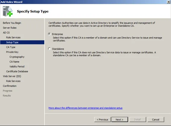 While you can set up a CA in standalone mode, Afaria will need Enterprise mode to work. This is also the reason why you have to use Windows Server 2008 R2 Enterprise version. Only there the Enterprise option for the CA is available. With Windows Server 2012 the standard version also offers a CA needed by Afaria, but right now, Afaria is not supporting Windows Server 2012.
