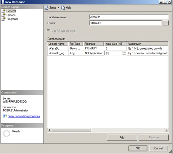 Enter a name for the database (AfariaDb) and give as initial log size 25 MB. The rest of the configuration parameters can be left as is.