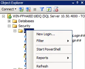 Select the Security folder and Login. Open the context menu and select New Login.
