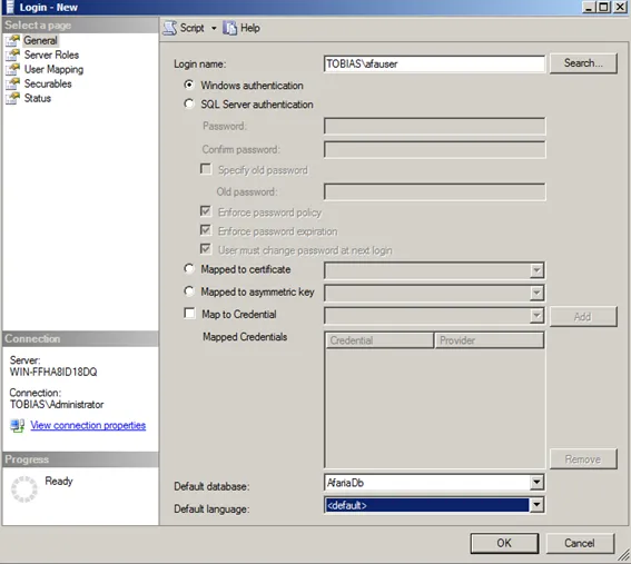 Chose as login name the afauser created in section preparation. Set as default database AfariaDb.