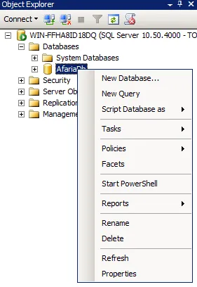 Select AfariaDb under SQL Server and Databases. Select New Query.
