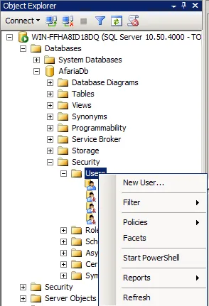 Next step is to assign to afauser the needed roles. Select Security -> Users under AfariaDb and click on New User.