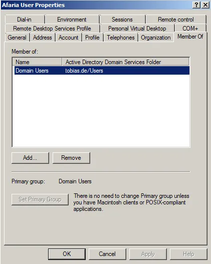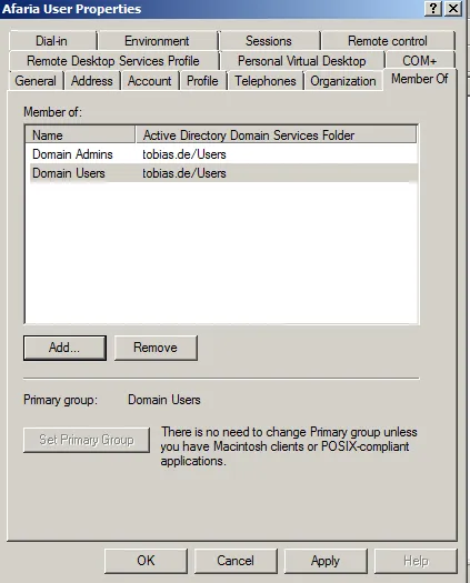 After the user afauser is created, the user must be prepared for Afaria tasks. This is done by adding him to the right user groups. By default, the user is already part of the domain users. It must be added to domain admins too.