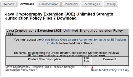 Click on the link: UnlimitedJCEPolicyJDK7.zip. This will download a ZIP file. The content of the ZIP file are 2 JAR files. These 2 files must be copied to the SMP 3 Java JVM.