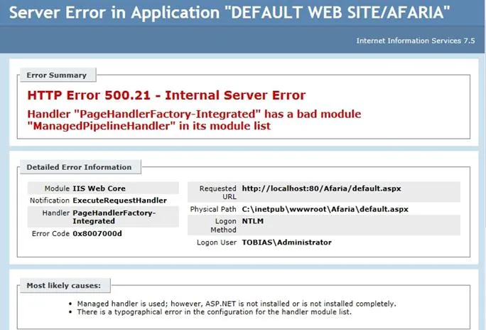When you access the Afaria web site, you get a IIS error (500.21). The error message suggests that maybe ASP.NET is not installed. The web site worked before and most probably you upgraded your Afaria server.