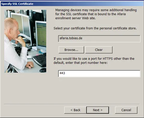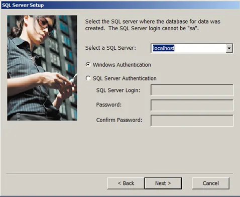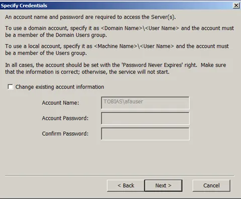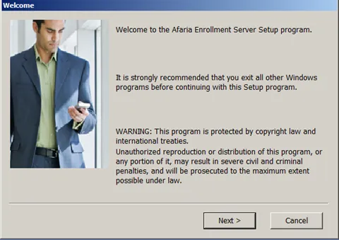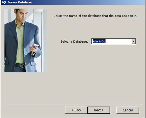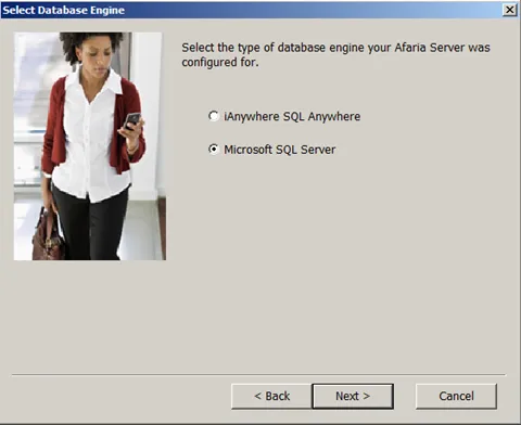 In case the setup program can connect to the DB server, it will show a list of databases available to the user. Select the Afaria DB. In case an error occurs, check with one of the previous blogs on how to solve this issue.