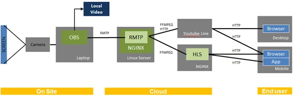 - NGINX with RMTP: receiving the video from OBS and process it to the further channels: YouTube and HLS.
