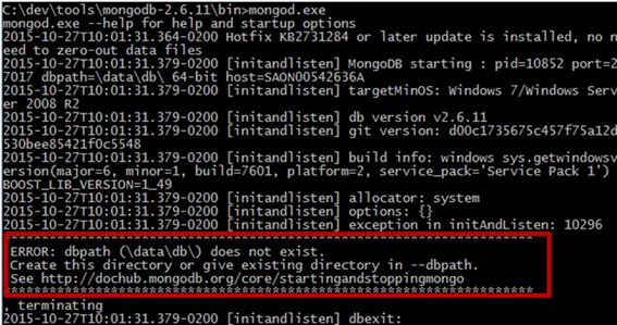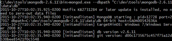 Command: mongod.exe –dbpath “C:\dev\tools\mongodb-2.6.11\data\db”