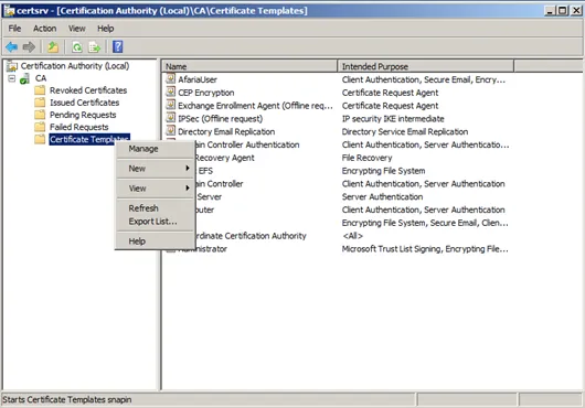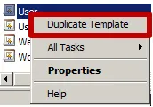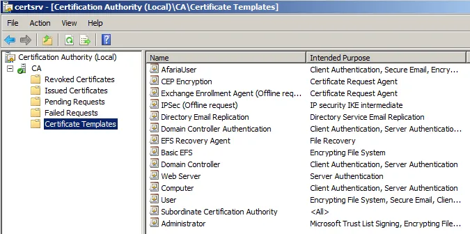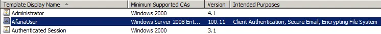 Next, select a base template and duplicate it. The new template will be based on this template and inherit some if its properties. It is a good idea to take the User template as a basis for certificates requested by Afaria via SCEP.