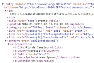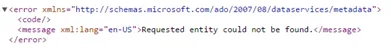 To access one entity, it is just using its ID as key and call it in the browser: http://localhost:8080/service.svc/Events(8L) 🔗 What I got as a response was an error message: Requested entity could not be found.