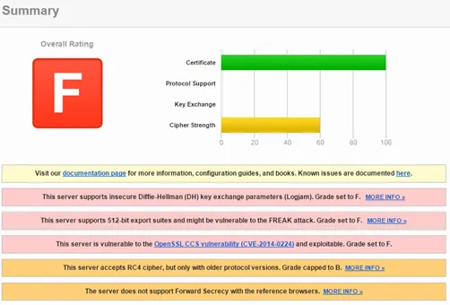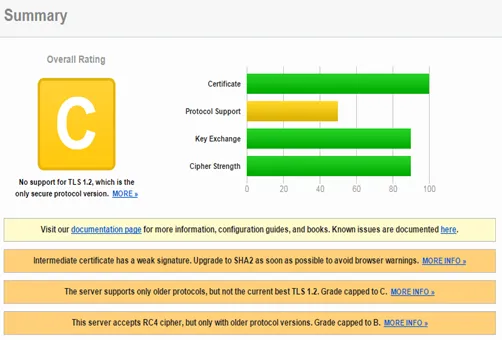 The problems that caused the C rating are all related to protocol support. Don`t worry, service.sap.com is the old support site, support.sap.com get an A rating. Only showing this here to demonstrate the impact the supported protocols have on the rating. The other 3 criteria were rated equally. Some sites can get an even worse result (that site is not related to SAP).