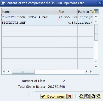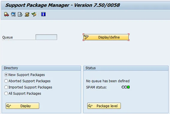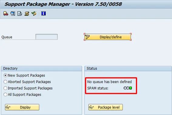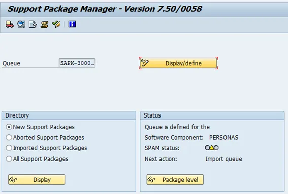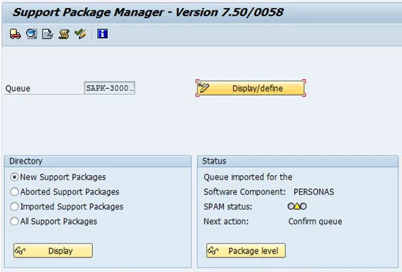 Check the uploaded package. Select new support package under directory and then display.