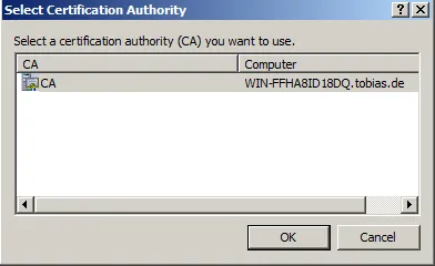 Inform the location of the CA. My CA is a Windows Enterprise CA, so its configuration is stored in the AD.