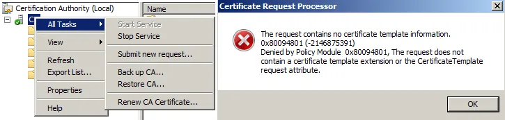 MSFT Enterprise CA needs the CSR created for a specific template, something that OpenSSL is not offering. If you submit such a request to the CA via MMC, you get an error message.