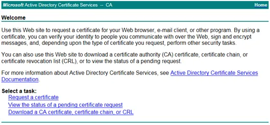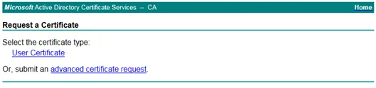 Open the web enrollment server in your browser. Click on Request a certificate.