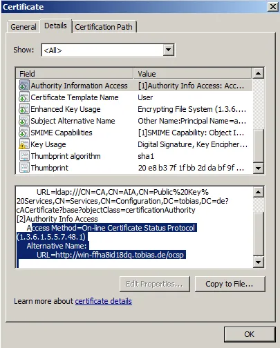 In the above step, a new user certificate was created, containing OCSP information. To test if OCSP is working, Microsoft is offering the certutil tool.
