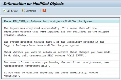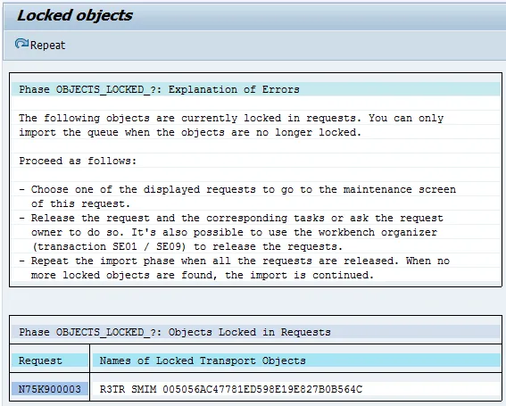 Another part to consider when installing a new service pack is that the objects that are part of a transport request are locked. If so, SPAM will show the following dialog: