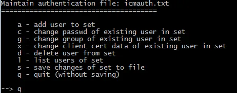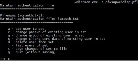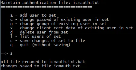 Inform the new password. As of now, the new password will not be available to WD, as it is not saved to icmauth.txt. To persist the new password you have to save it. To do so, select s from the menu.