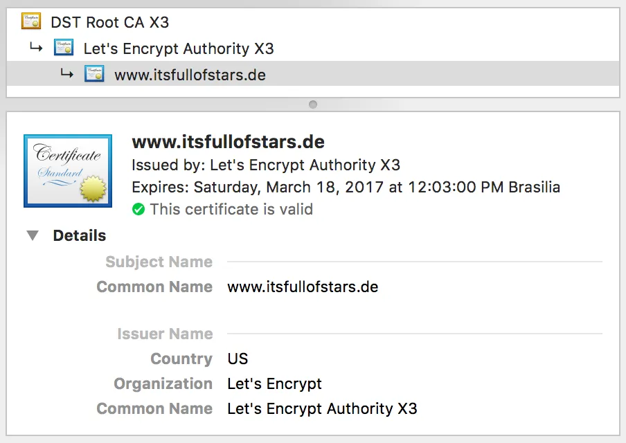 The TLS certificate was originally provided by StartSSL ๐, but after they proved to not understand how trust works [1 ๐] [2 ๐] [3 ๐] [4 ๐], I switched over to letsencrypt ๐. I consider this a change for the good: great community, easy installation process, open, high level of security for the certificate and I must change the certificate every three months ๐.