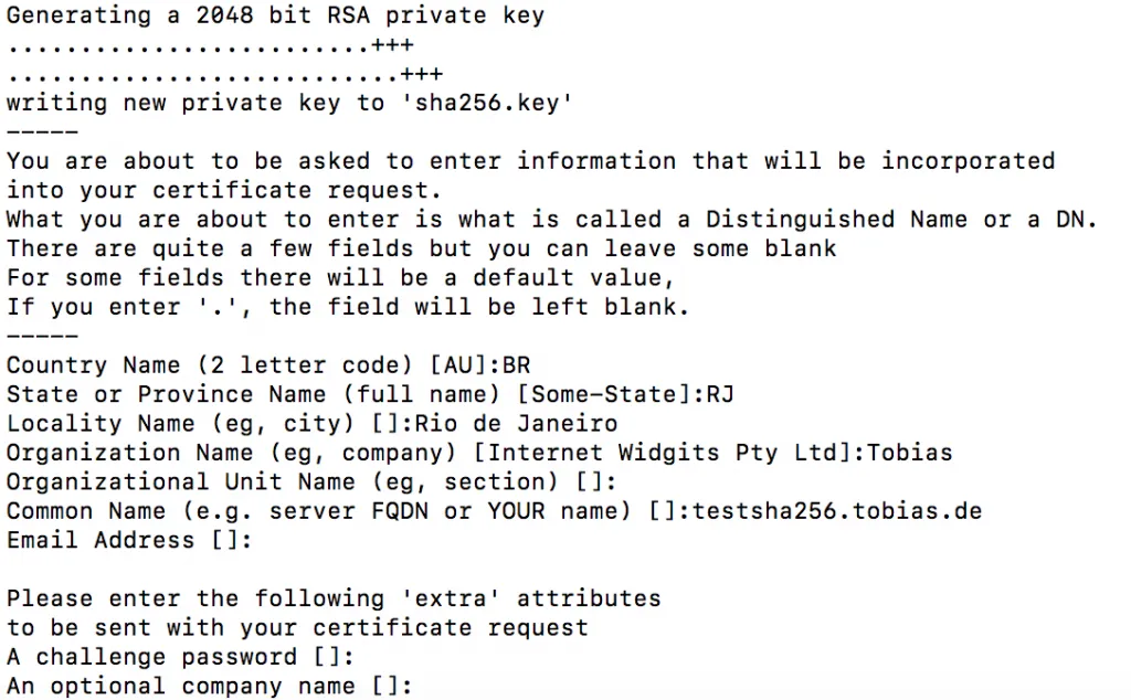 openssl req -out sha256.csr -new -newkey rsa:2048 -nodes -keyout sha256.key -sha256