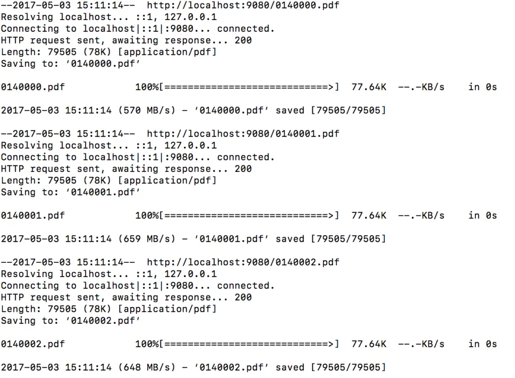 Adding the wget command in the printf directive allows to download the files. The execution flow is to let the FOR loop together with printf create the right number with mask, and wget downloads the file. After the file is download, the next iteration of the FOR loop starts, and the next file is downloaded. Assuming that I have PDF documents named 0140000.pdf to 0140005.pdf on server http://localhost:9080 🔗, the FOR loop with wget is: