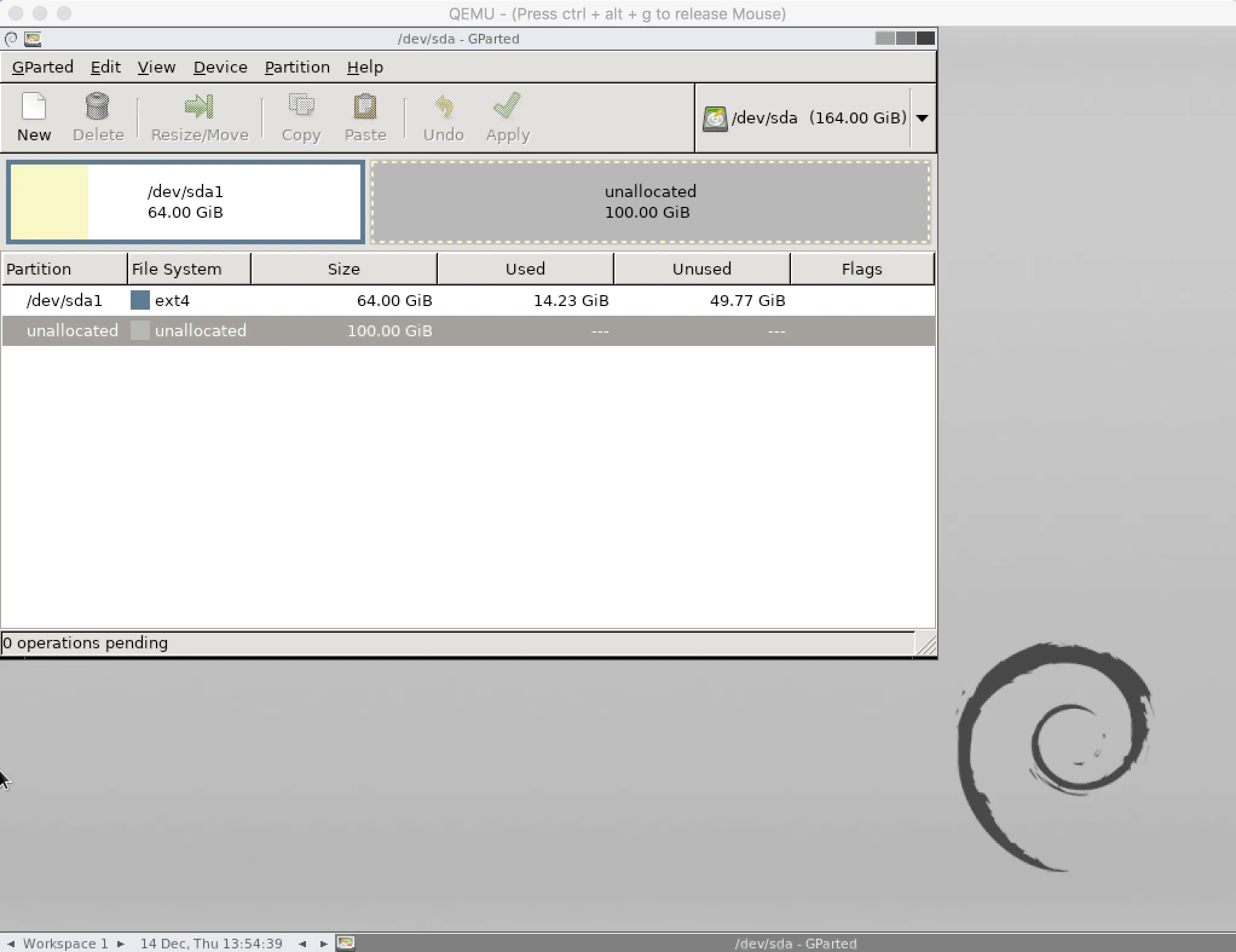 The default values should be enough. This gives you a keyboard, mouse, English and X. After that, Gparted is started and you should see the Docker.qcow2 disk in the Gparted app.