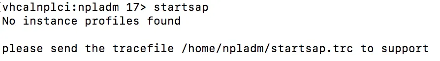 When you log in to your container and run startsap, the program will fail. It will report that no instance profiles were found.