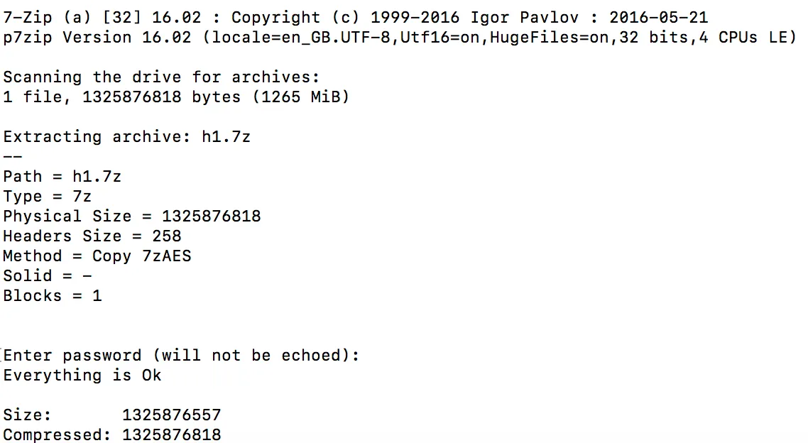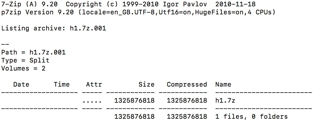 We can see that the split archives contain one file named h1.7z. That is the zip file created by 7zip under Windows.