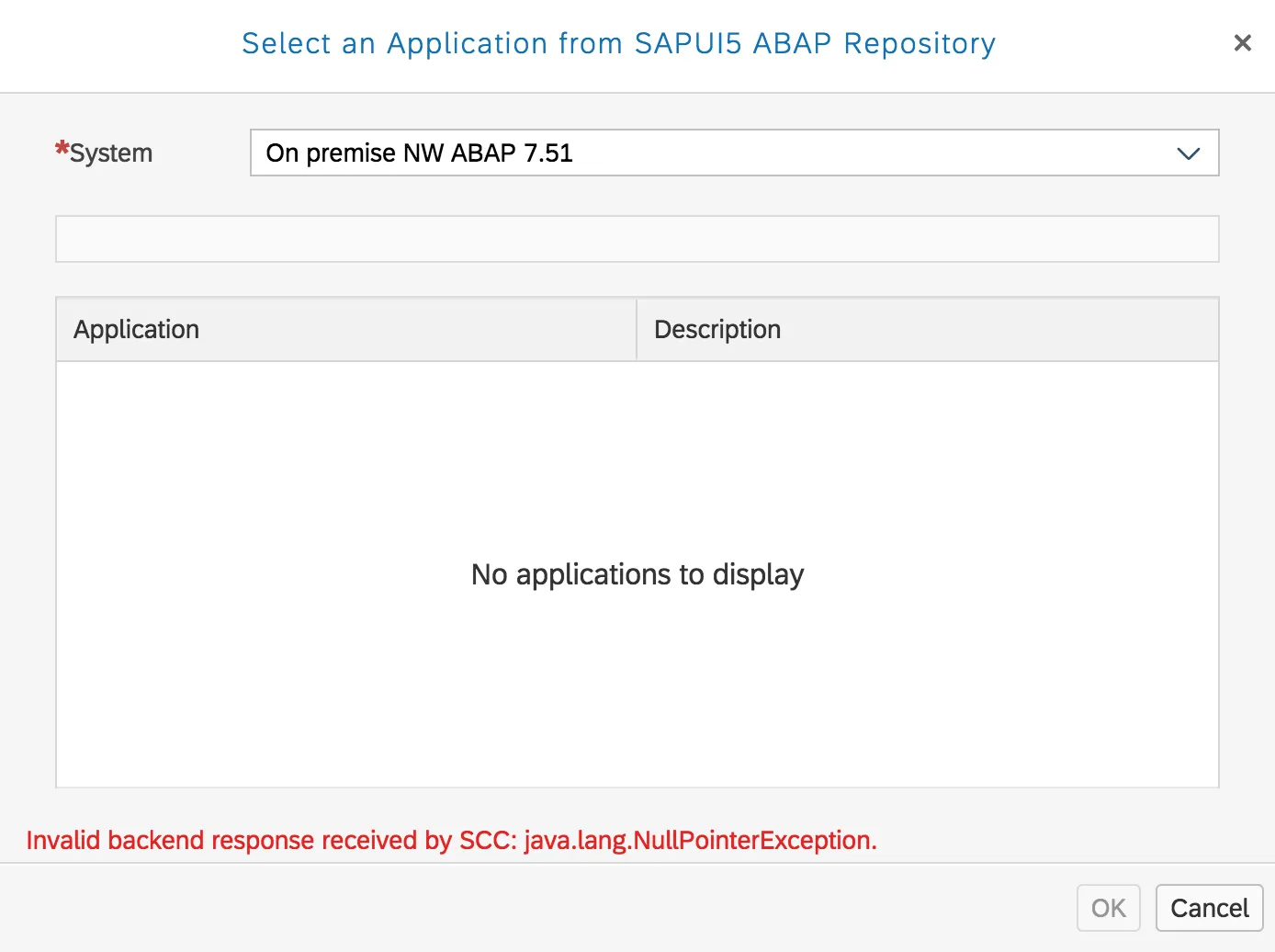 After selecting the on premise system destination, an error message is displayed. The actual error message can differ. Sometimes you see an informative error message or just some red text or maybe nothing.