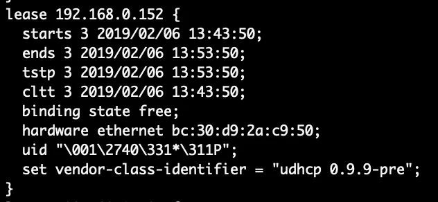 The assigned leases can be found in the dhcpd.leases file. All leases assigned are listed here, including the mac address, IP address, start and end time of the lease. If all works out as planned, the soundbar will be in there with the static IP.