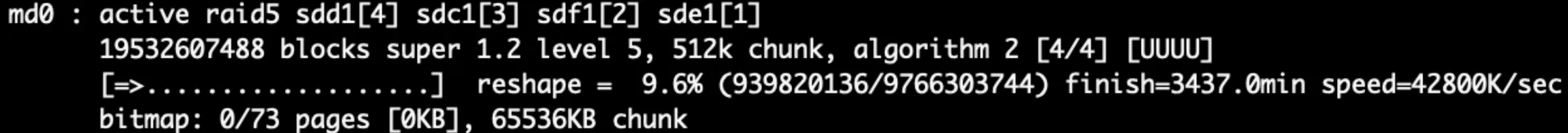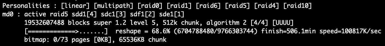 When you add a new HDD to an existing RAID, a sync is started. In my case I added a 10TB disk to a RAID5. The sync started and as estimated time I got something in the range of days. The estimated time is listed in finish=5384 min.