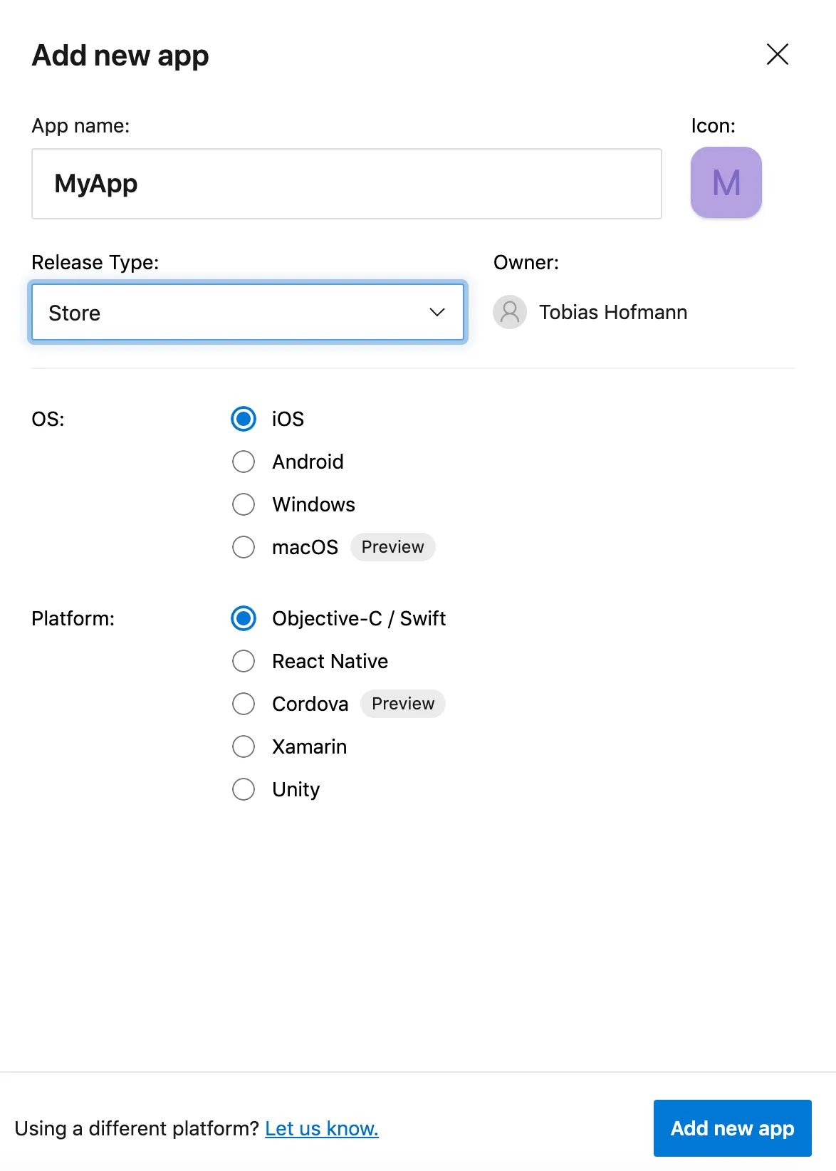 Open AppCenter 🔗 and create a new project.